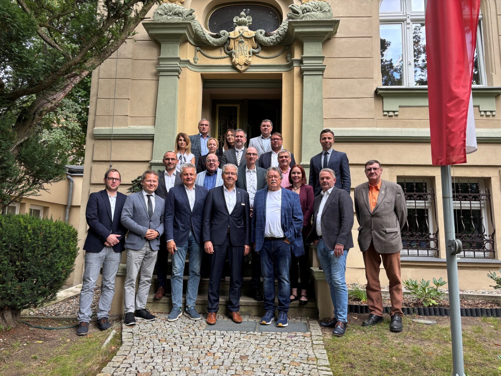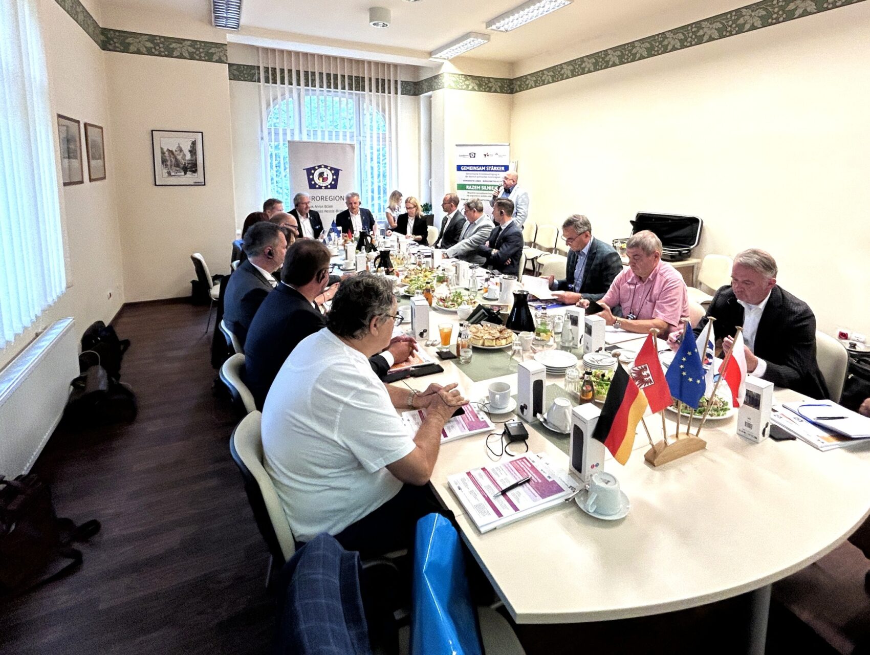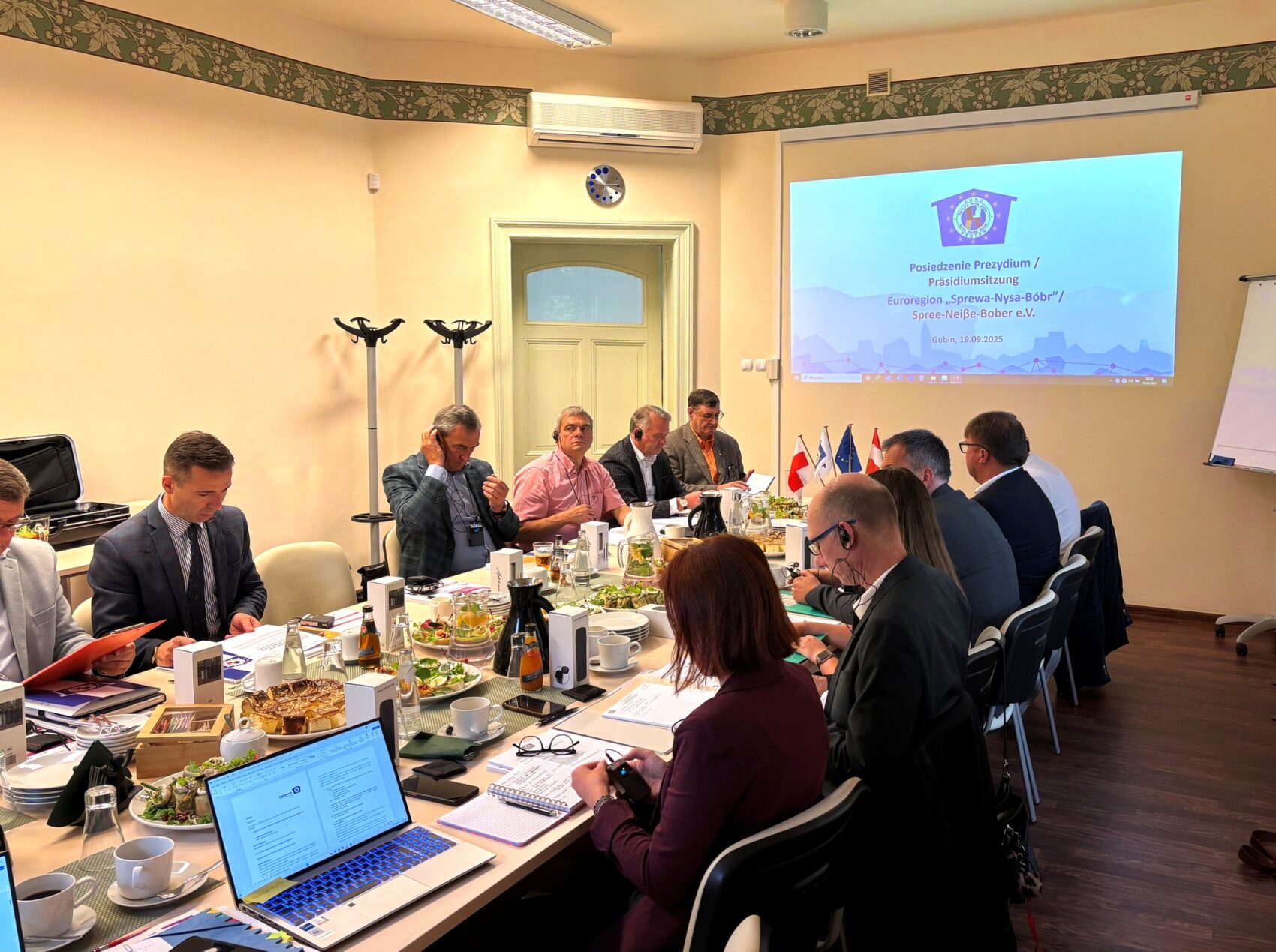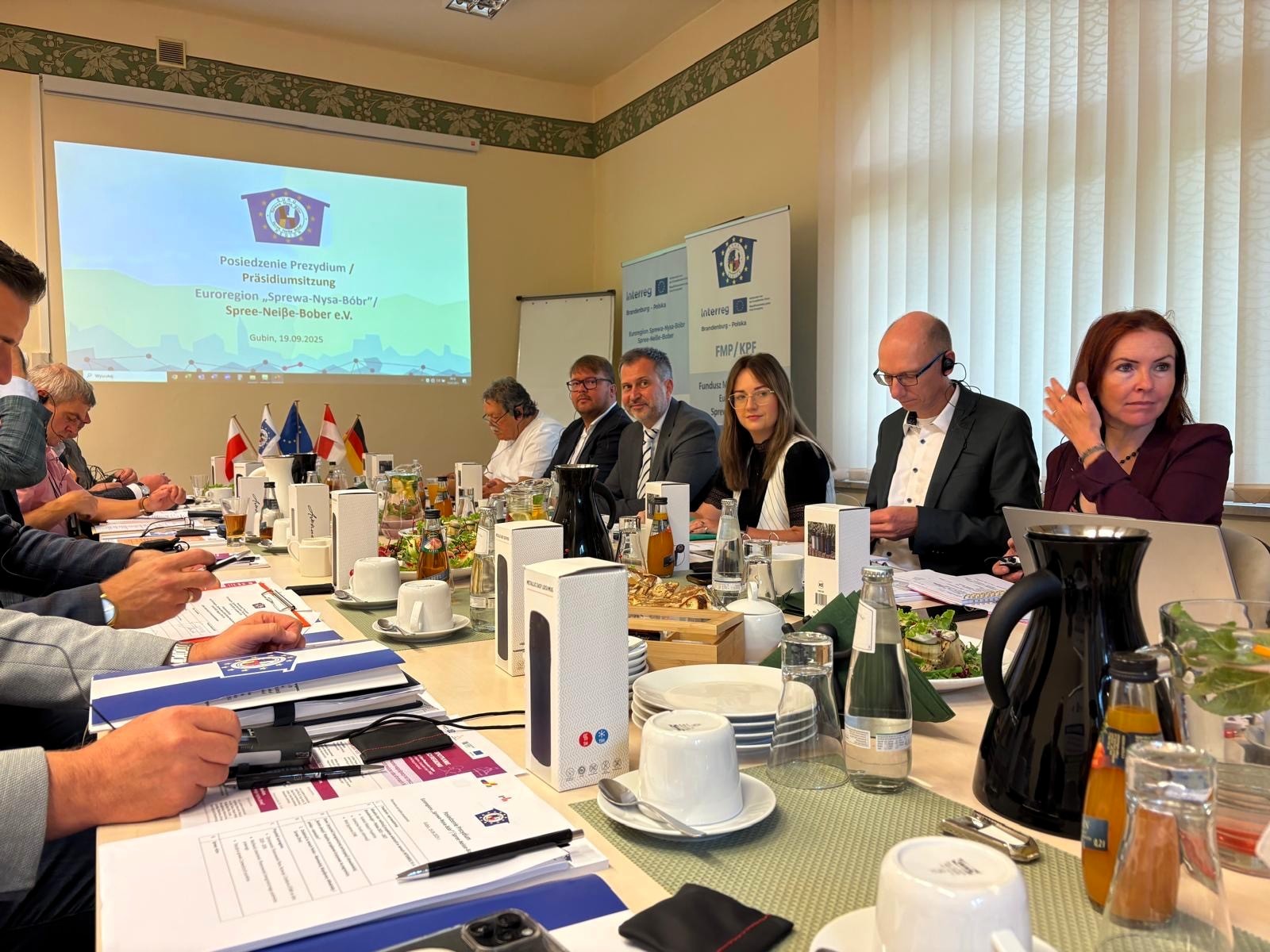 19.09.2025 r. w siedzibie naszego stowarzyszenia odbyło się posiedzenie Konwentu Euroregionu „Sprewa-Nysa-Bóbr” oraz Prezydium Euroregionu, czyli gremium składającego się z konwentu polskiej i zarządu niemieckiej strony. Posiedzeniu Prezydium przewodzili Prezes Konwentu Pan Czesław Fiedorowicz oraz Prezydent Zarządu Pan Harald Altekrüger. Tematy spotkania koncentrowały się wokół: